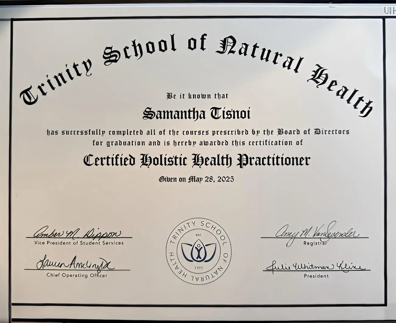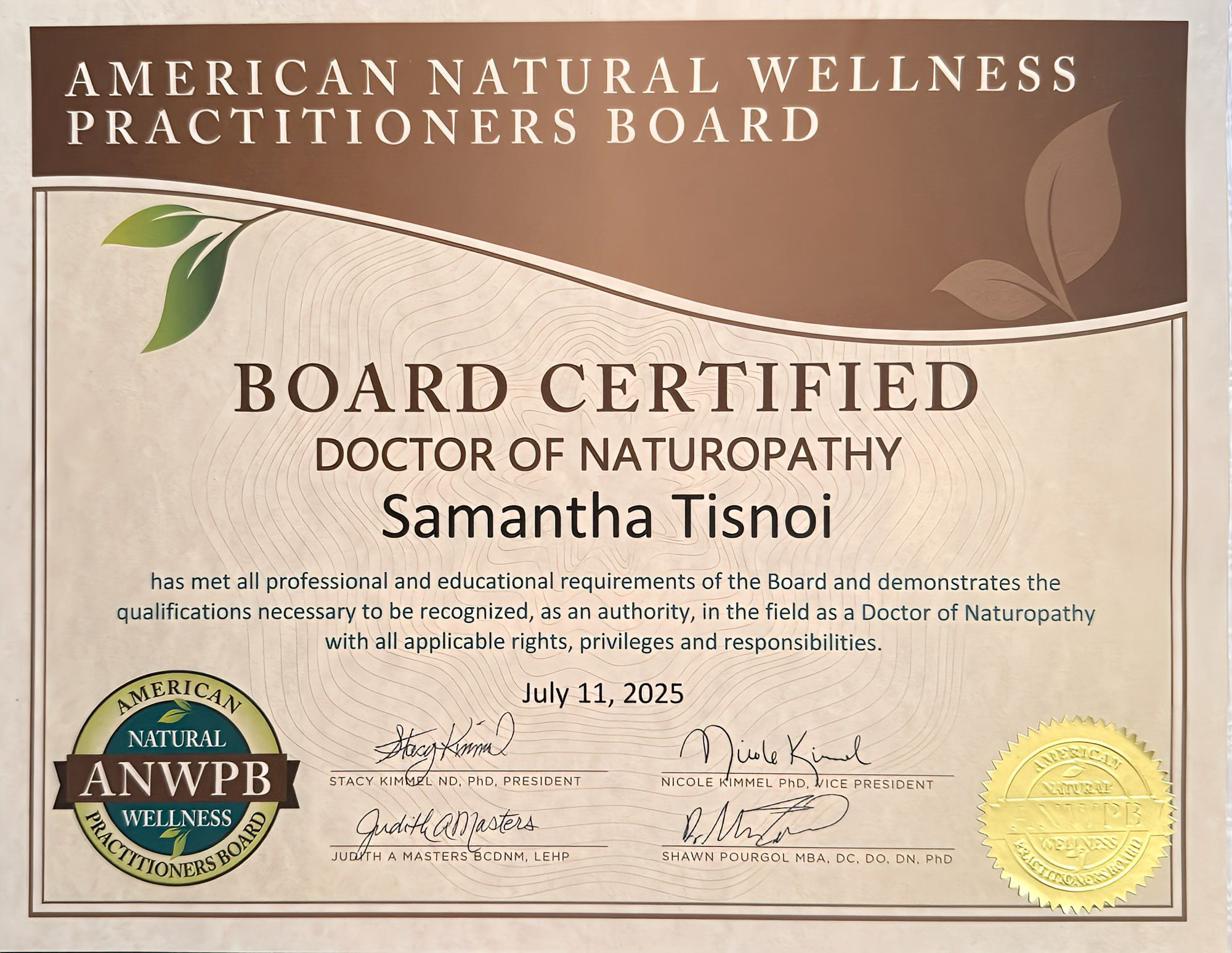 My name is Samantha Tisnoi, and I’m a Board-Certified Doctor of Naturopathy (BCND), Certified Holistic Health Practitioner, Board-Certified Natural Health Practitioner, and Licensed Aesthetician. I specialize in helping individuals uncover the root causes of their health challenges and walk a path toward whole-body healing—naturally, gently, and with purpose.